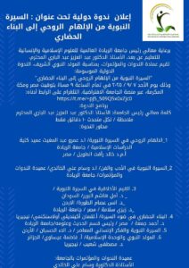 برعاية معالي رئيس جامعة الريادة العالمية للعلوم الإسلامية والإنسانية للتعليم عن بعد، الأستاذ الدكتور عبد العزيز عبد الباري المحترم،تقيم عمادة الندوات والمؤتمرات، بمناسبة المولد النبوي الشريف، الندوة الدولية الموسومة